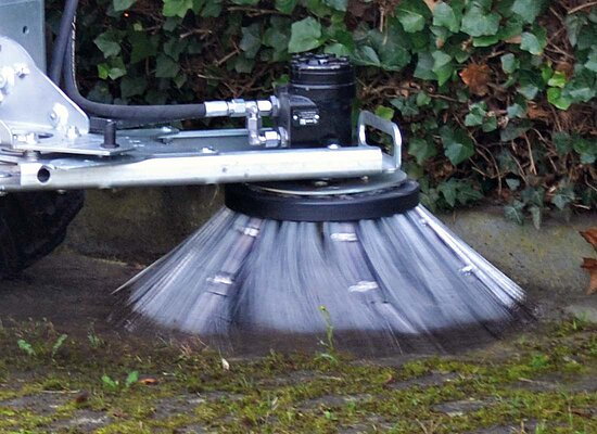 Datorită torsadelor de sârmă robuste, peria pentru buruieni WKB 550 înlătură eficient mușchiul din rosturi și chiar și vegetația densă de buruieni. Peria, cu un diametru de 550 mm, se poate înclina la 180 de grade de la stânga la dreapta, depozitând ordonat mușchiul sau resturile vegetale de-o parte.